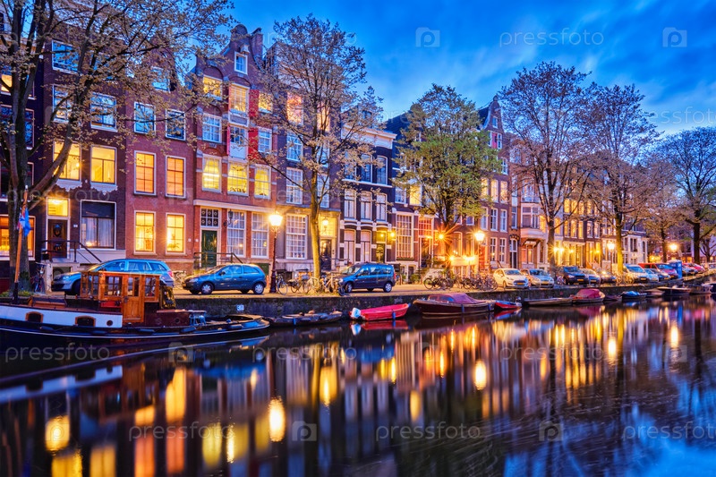 Ночной вид на городской пейзаж Амстердама с каналами, лодками и средневековыми домами освещается в сумерках