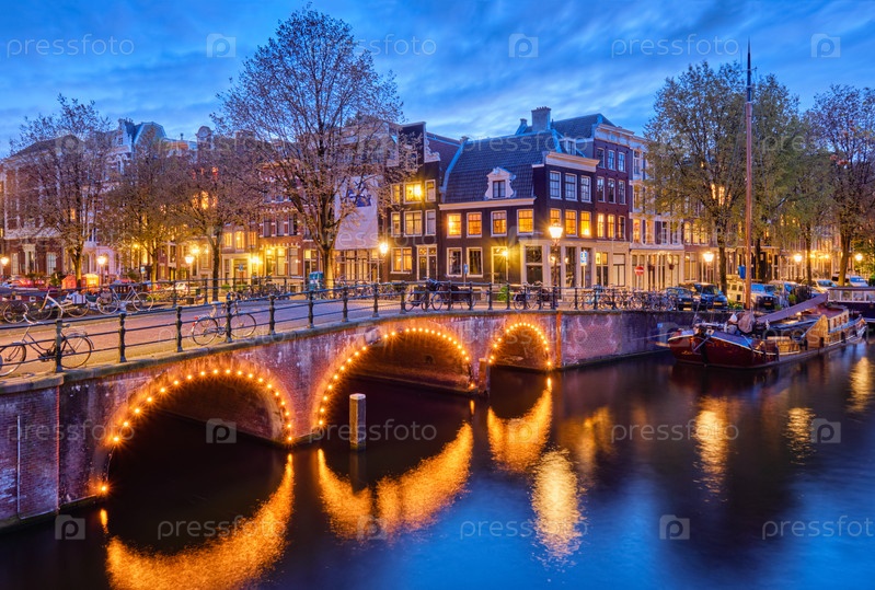 Ночной вид на городской пейзаж Амстердама с каналами, мостами и средневековыми домами освещается в вечернее сумерки