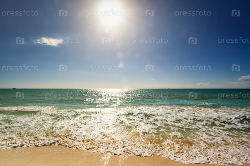 Красивый пляж и волны Карибского бассейна с голубым небом и солнцем