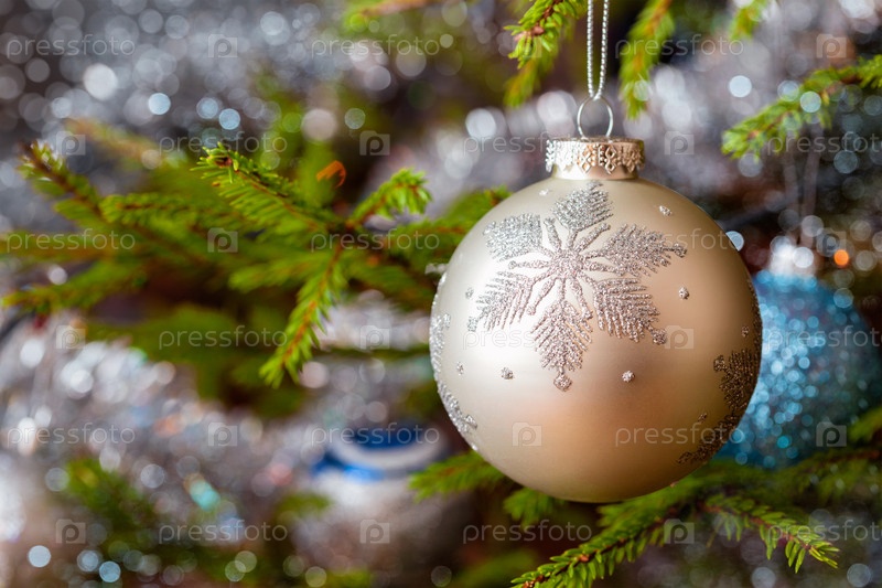Рождественский фон - украшение рождественской елки на декорированной рождественской елке с размытыми туманными огнями боке и кописпалом