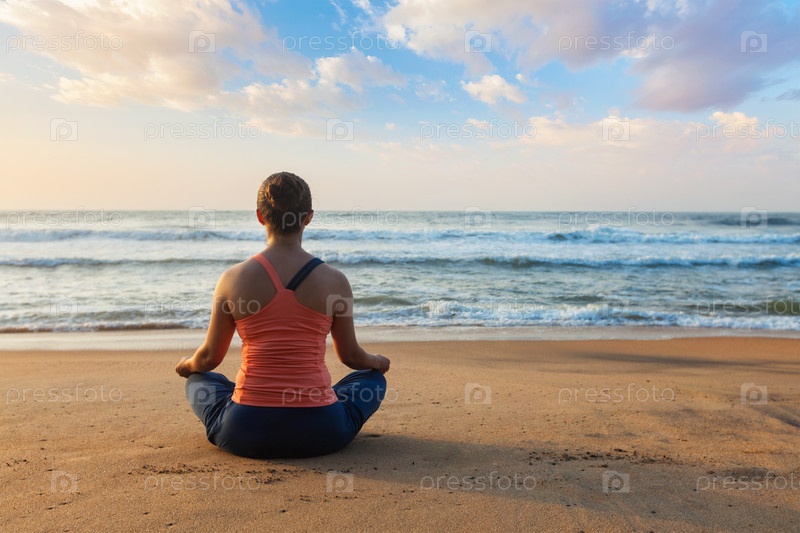 Молодая спортивная женщина, практикующая йогу - медитацию и расслабление в Позе лотоса Падмасана) с наружным подбородком на тропическом пляже при закате солнца
