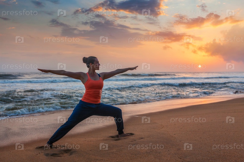 Женщина, практикующая хата-йогу асану Вирабхадрасана 1 Воин позирует на открытом воздухе на пляже океана при закате солнца