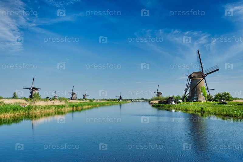 Голландская деревня с ветряными мельницами на знаменитом туристическом объекте Kinderdijk в Нидерландах