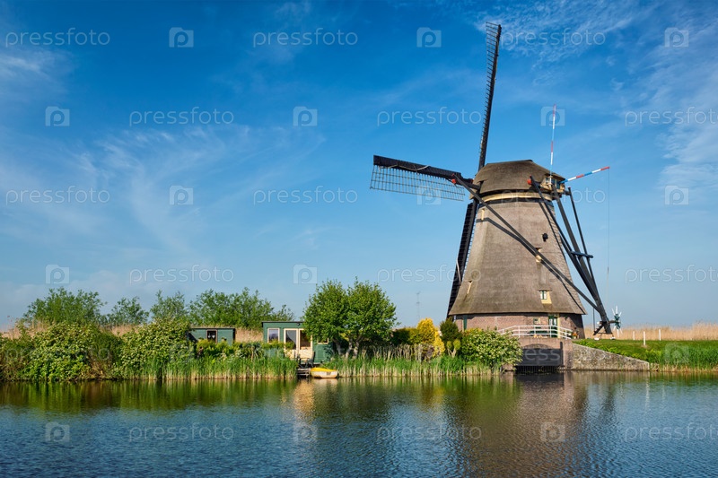 Голландская деревня с ветряными мельницами на знаменитом туристическом объекте Kinderdijk в Нидерландах