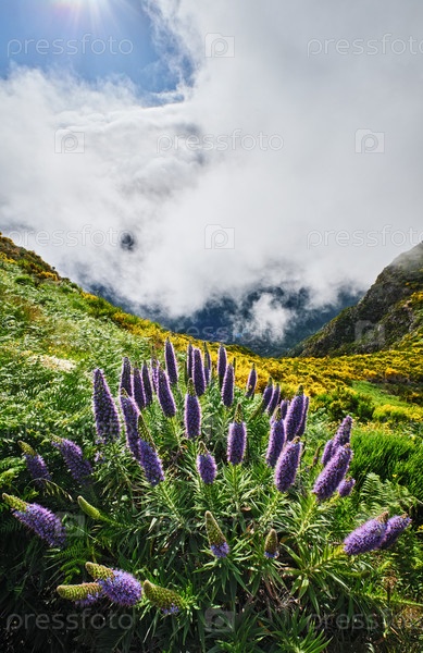 Ландшафт Мадейры с цветами гордости Мадейры и цветущими кустарниками Китиса и горами в облаках