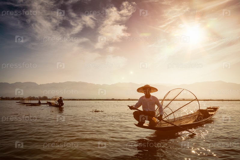 Традиционный бирманский рыбак на озере Инле, Мьянма, известный своим характерным стилем одноногих гребцов