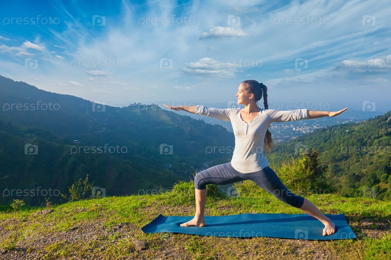 Йога на открытом воздухе - Атлетическая женщина, занимающаяся йогой Асана Вирабхадрасана 2 - Поза воина на открытом воздухе в горах Гималаев утром