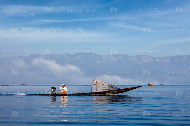 Достопримечательности Мьянмы - традиционный бирманский рыбак с рыболовными сетями на озере Инле на высокоскоростной моторной лодке