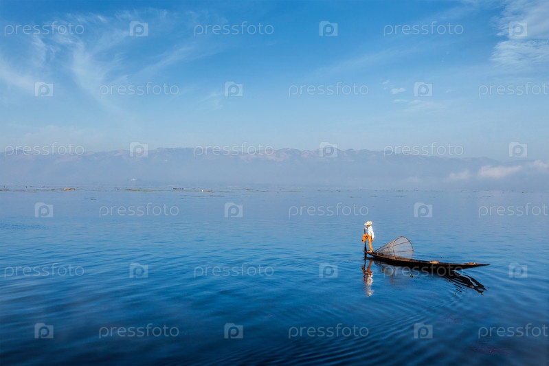 Традиционный бирманский рыбак на озере Инле, Мьянма, известный своим характерным стилем одноногих гребцов