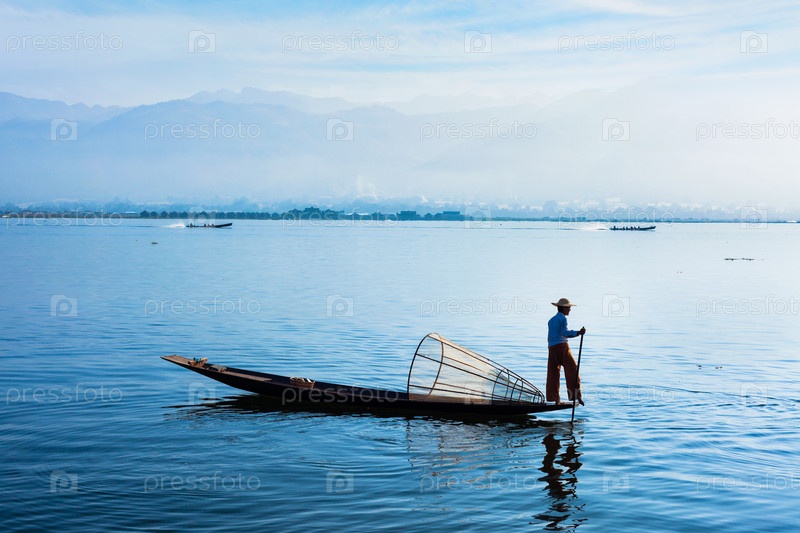 Традиционный бирманский рыбак на озере Инле, Мьянма, известный своим характерным стилем одноногих гребцов