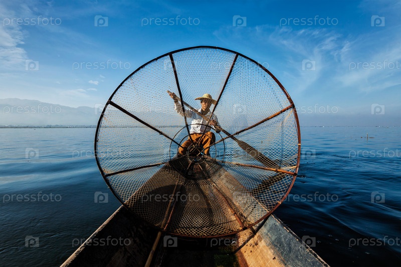 Традиционный бирманский рыбак с рыболовными сетями на озере Инле в Мьянме известен своим отличительным одноногим стилем гребли, вид из лодки