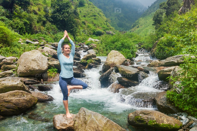 Женщина в асане йоги Vrikshasana позирует у водопада на открытом воздухе