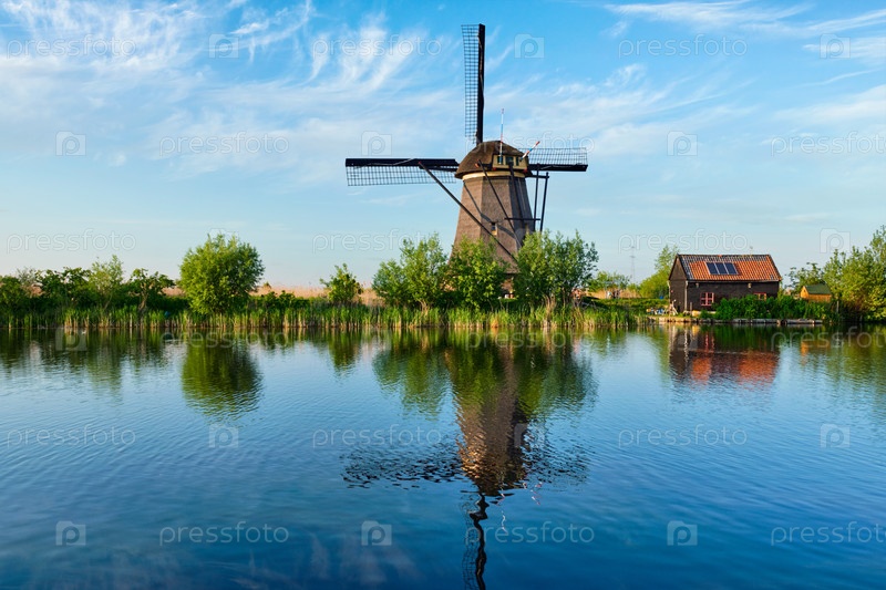 Голландская деревня с ветряными мельницами на знаменитом туристическом объекте Kinderdijk в Нидерландах