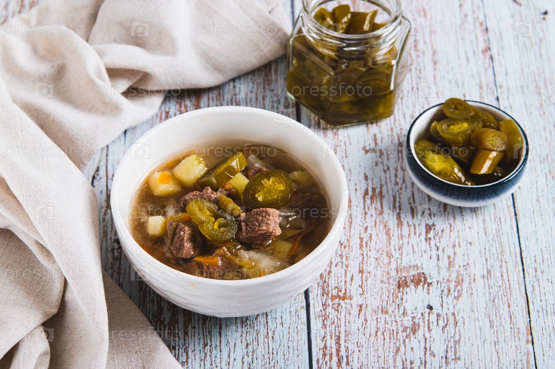 Пикантный мексиканский суп с мясом и жалопенами в миске на столе