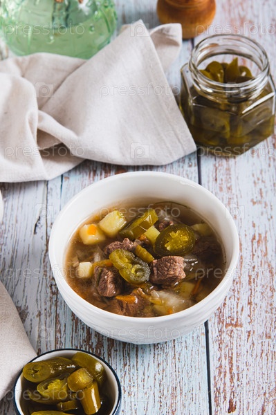 Пикантный мексиканский суп с мясом и халопенос в миске на столе вертикальный вид