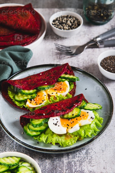 блины из свеклы чиа с яйцом, огурцем и салатами на тарелке с вертикальным видом