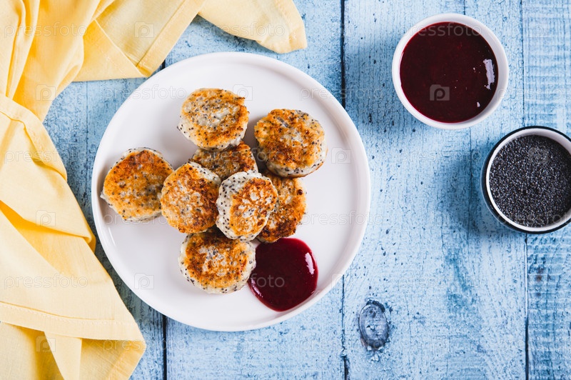 Мини-печенье из сливочного сырья с маковыми семенами и ягодным варенем на тарелке на столе наверху