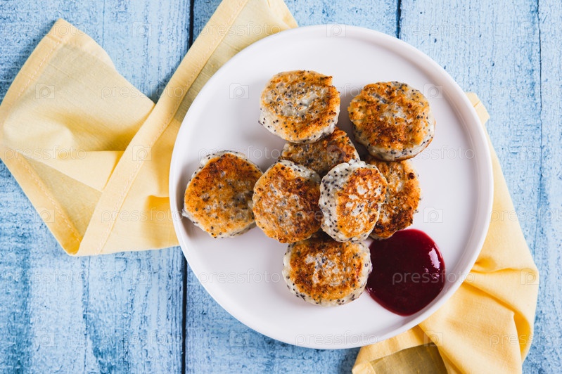 Закройте мини-панельки с маковыми семенами и ягодным вареньем на поверхности тарелки
