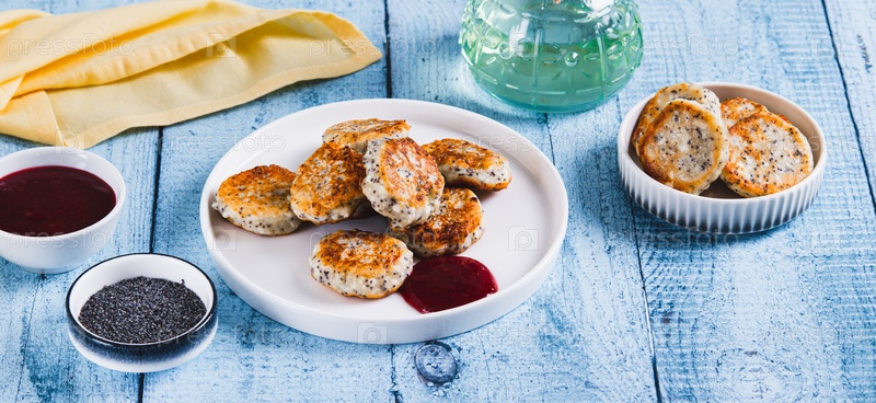 Мини-панкеки с сыром из коттеджа с маковыми семенами и ягодным вареньем на тарелке на столе WEB баннер