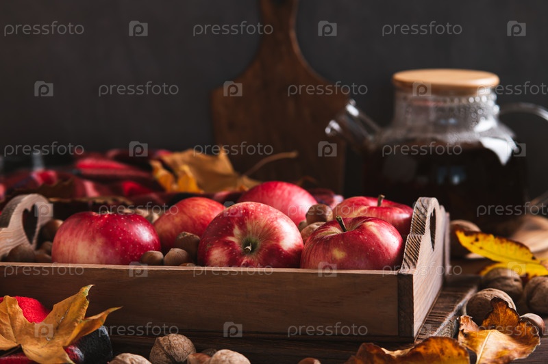 Красные яблоки и орехи в коробке, осенние листья и чайник на столе