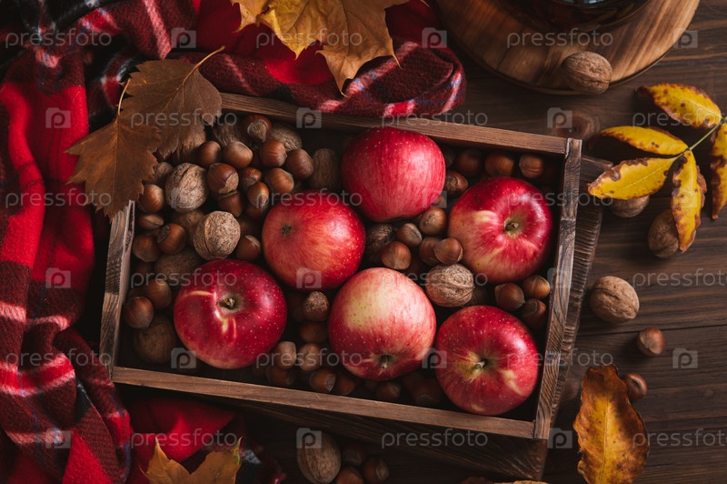 Красные яблоки и орехи в коробке, осенние листья и чайник на столе