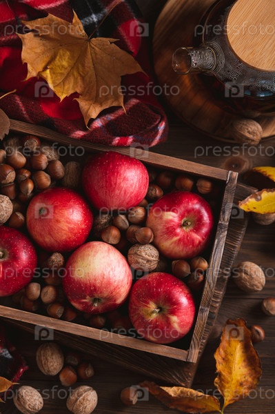 Уютный осенний натюрморт с яблоками, орехами и чаем на деревянной столешнице и вертикальным видом