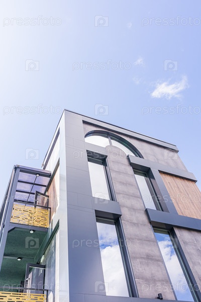 Фронт административного или делового здания коричневый с большими рамочными окнами. городская архитектура красивого здания на фоне синего неба
