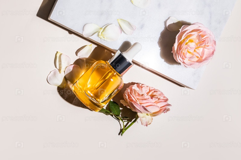 Прозрачная бутылка с капельницей с натуральным органическим продуктом, сывороткой молока, маслом для ухода за кожей лица и тела лежала на мраморном подиуме с розами