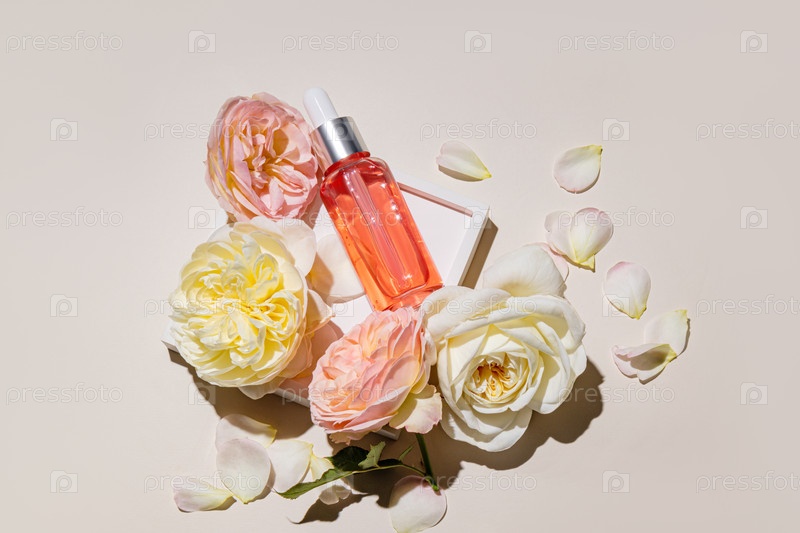 Прозрачная бутылка капельницы с косметическим продуктом для ухода за кожей лица и тела дома на белом подносе среди свежих роз. ароматный продукт. вид сверху