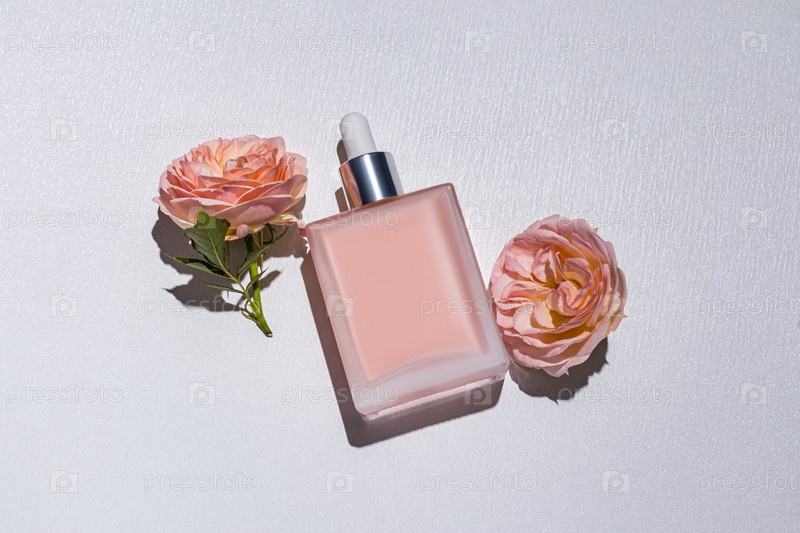 Белое оформление прямоугольной косметической бутылки с пипетой на белом фоне с нежными розовыми цветами