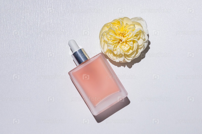 Матовая прямоугольная бутылка с пипетой с сывороткой, косметический продукт на светлом фоне с желто-розовой головкой. пустая компоновка бутылки. верхний вид