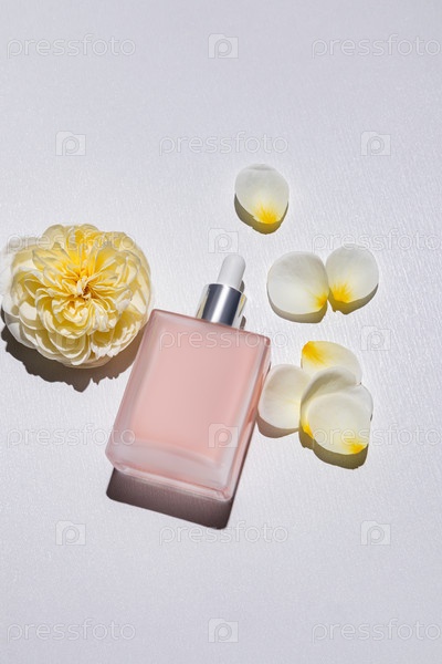 Косметическая бутылка с капельницей с натуральным продуктом самообслуживания. Модель с матовой бутылкой. Вертикальный фон с желтой розой и шикарными лепестками