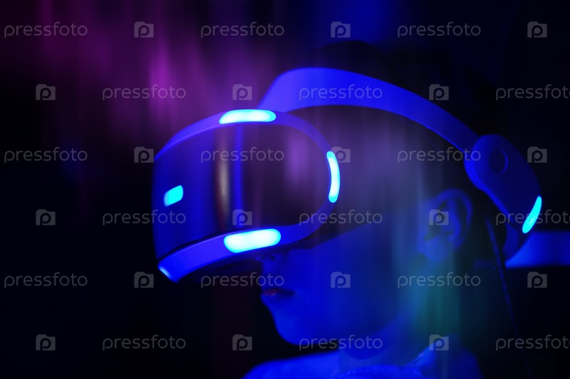 Мужчина в синей гарнитуре виртуальной реальности.Мужчина смотрит на камеру.Концепция волнения и ожидания, когда человек готовится войти в виртуальный мир