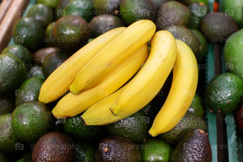 Ветка спелых бананов и авокадо для продажи в магазине