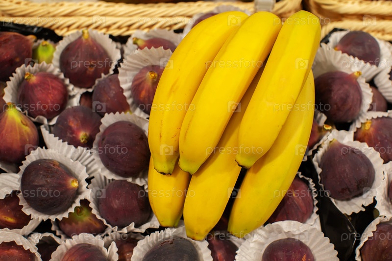 Ветка спелых бананов и инжиров для продажи в магазине