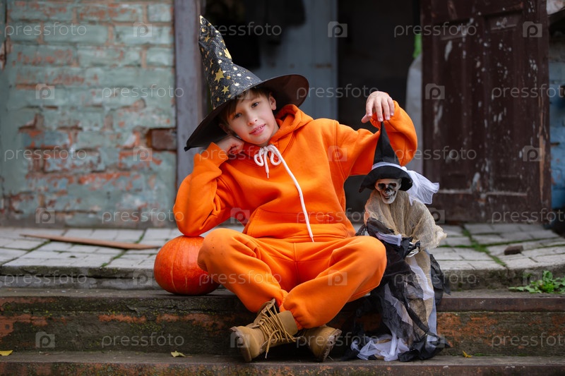 Ребенок в оранжевом костюме и волшебной шляпе на Хэллоуин.Мальчик держит скелет на вечеринке