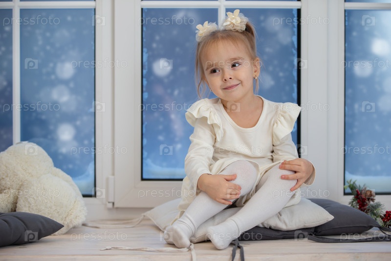 Счастливая девочка сидит на подоконнике снежного окна и улыбается