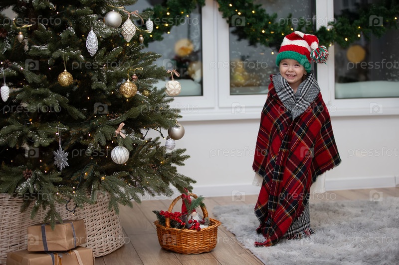 Счастливая маленькая девочка в шляпе Санта-Клауса, завернутой в теплое платеновое одеяло в интерьере рождественской комнаты