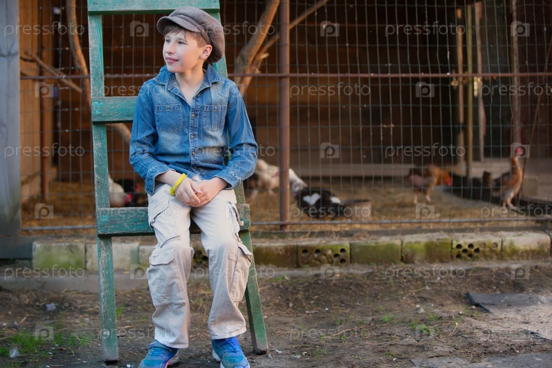 Старый деревенский мальчик в шляпе и джинсовой куртке на фоне цыпленка