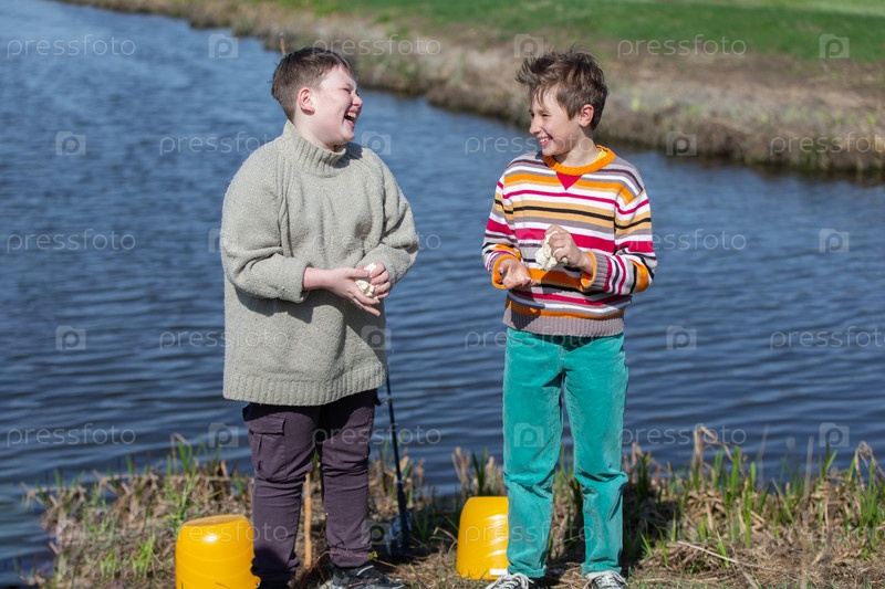 Два мальчика, ловя рыбу, делают из теста приманку для рыб.Они разговаривают и смеются