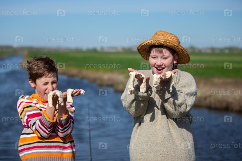 Два мальчика, ловя рыбу, делают из теста приманку для рыб.Они разговаривают и смеются