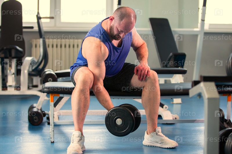Мужчина поднимает тяжести в тренажерном зале.Он держит гантели в одной руке