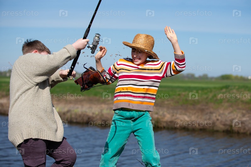 Два друга мальчика зацепили старую рыболовную удочку для обуви и посмеялись