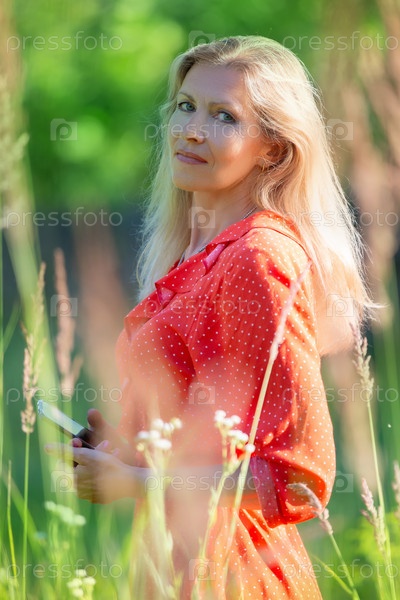 Вертикальный портрет красивой блондинки средних лет среди зеленой травы