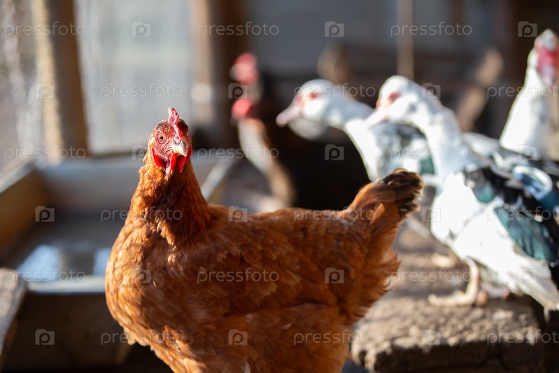 Курица стоит во дворе рядом с шлангом.Курица коричневая и черная с красным клювом