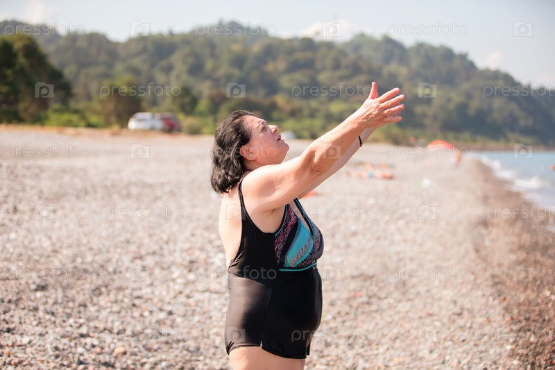 Пожилая женщина в купальнике занимается спортом и дыхательными упражнениями на пляже