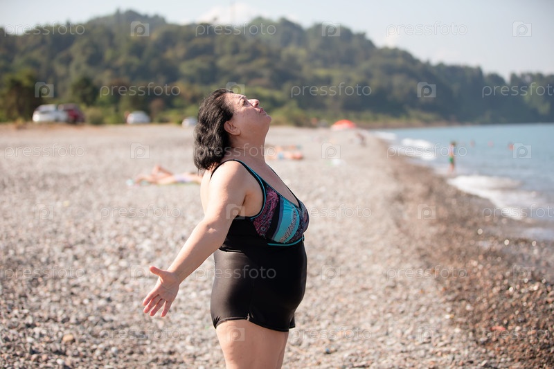 Пожилая женщина в купальнике занимается спортом и дыхательными упражнениями на пляже