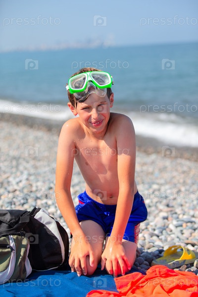 Забавный мальчик на пляже в купальных очках смотрит в камеру