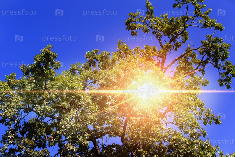 Солнечные лучи проникают через листья дерева. Диффузный солнечный свет фильтруется сквозь зеленые листья. Солнечное лето естественным фоном с солнечным светом