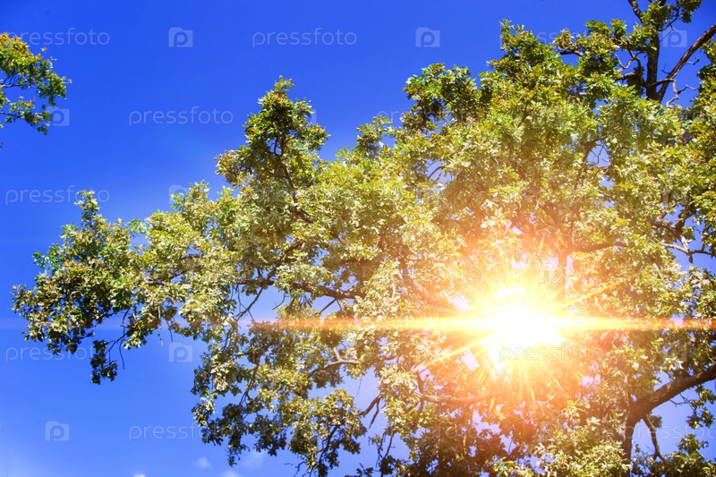 Солнечное лето естественный фон с солнечным светом, сияющим сквозь зеленую древесную листву